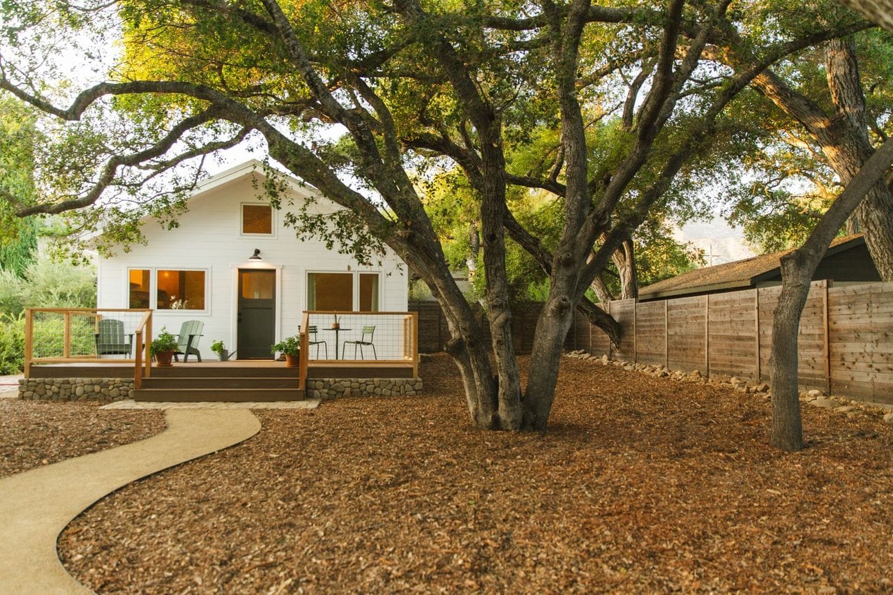 The compact structure is a 1BR/1BA with vaulted ceilings and filled with natural light. Located in a charming neighborhood, the Owlet is walking distance to downtown Ojai. Tucked at the back of the property and nestled under a canopy of oaks, the home is private making the cottage feel like a peaceful retreat.