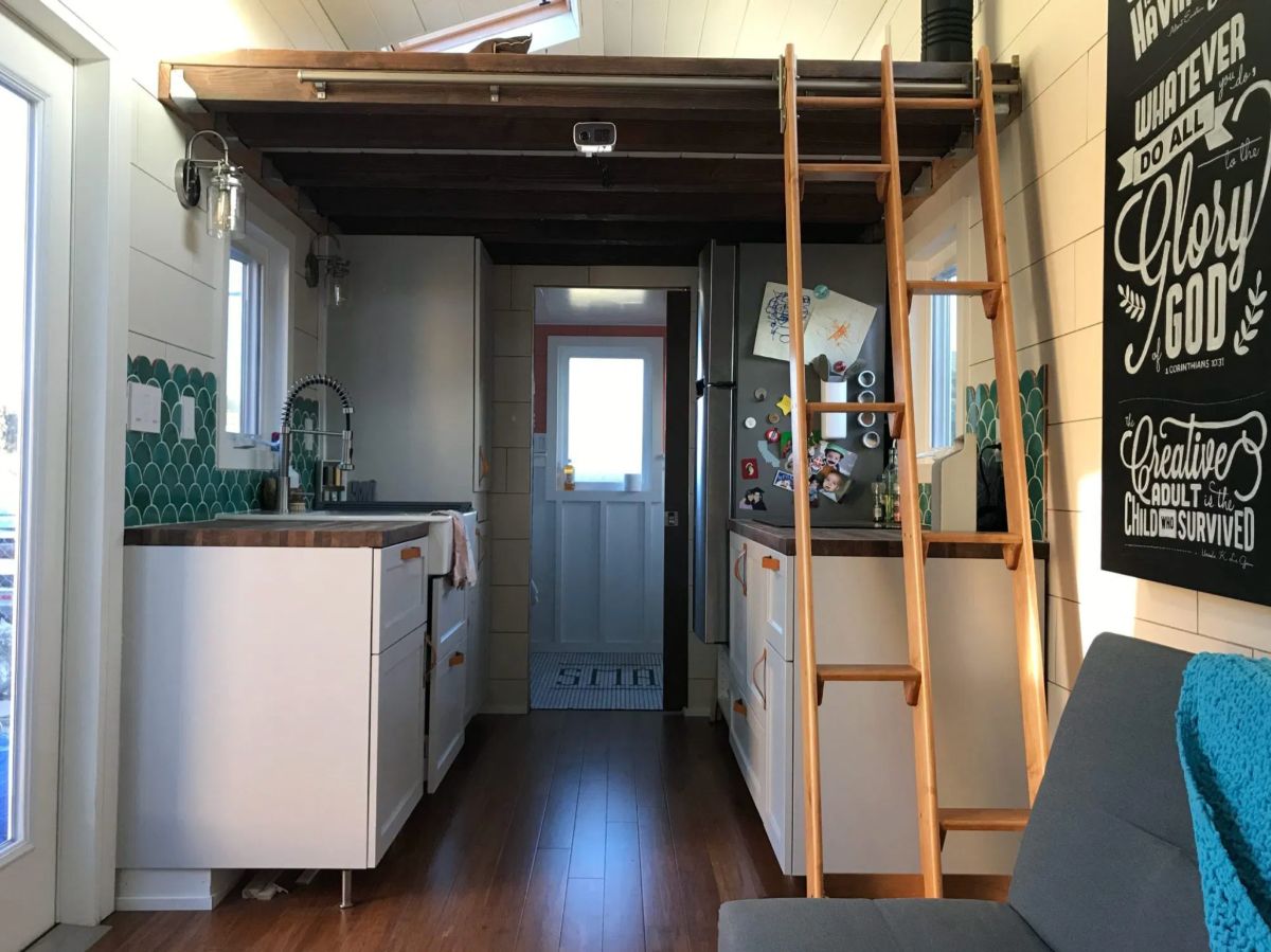 Tiffany is a graphic designer who wanted to design and build her own tiny house. She decided to hire Vina to help her with a custom tiny house design. After one year of building, Tiffany finished her house almost completely on her own, with a lot of grit and determination. We’re thrilled to see the creativity in this custom design that makes it uniquely Tiffany – from the large projector screen to the custom bathroom tiles. After living tiny for many years, Tiffany is able to pursue her life with more freedom than ever before.
